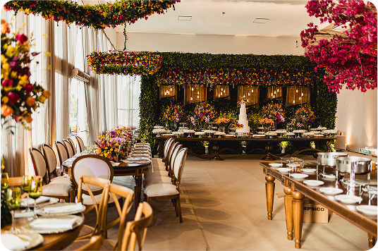 Com design moderno e paredes de vidro, o salão contemporâneo proporciona integração total com a natureza ao redor. Seu layout aberto permite personalizações criativas e diferentes configurações para casamentos, eventos sociais e corporativos.